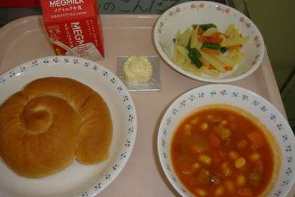 「ポークビーンズがほかほかで大豆がやわらかくておいしかったです。じゃがいものソティは,じゃがいもの味つけがおいしかったです。バターうずまきパンのバターの味もおいしかったです。」・・・・・4年生の感想から