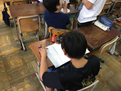 雨の日は,子ども達も外に遊びの行くことができません。教室や,ライブラリーロードなどで,思い思いの過ごし方をしています。みんなでトランプをしたり,中には,自習したりしている児童もいます。どうやら,今日の授業で実施される「理科ビンゴ」の下準備をしているそうです。最後の写真は「理科ビンゴ」の本番の写真です。