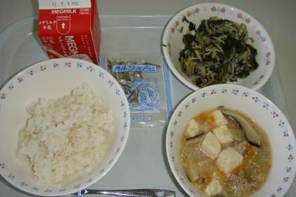 今日の献立は,「麦ごはん・牛乳・五目豆腐・ほうれん草ともやしのいためナムル・じゃこ」でした。