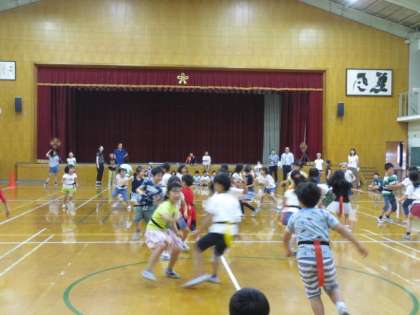 スポーツ保健委員会が計画した,タグ取り大会が始まりました。1〜3年生がクラス対抗で中間休みに開催しました。タグベルトを腰に巻き,それにタグを後ろにつけます。