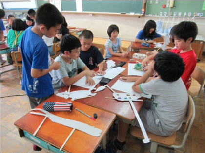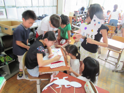 クラスを4つのグループに分け,前回作った作品を持ち寄って,物語を作りました。活発に意見を出し合い,それぞれのオリジナルストーリーが完成したようです。次週,学年で集まって発表する予定です。