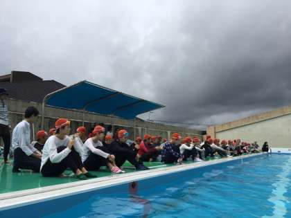 着衣泳とは,服を着たまま水中で活動すると,どのような変化があるのかを確認する活動です。水辺での事故に出会った時,私たちはどのようなことに気を付けたらいいのでしょう。ポイントは,体力を温存しながら助けを待つということです。体の力を抜いてできるだけ楽に水面に浮いてみました。ペットボトル等の浮きやすいものがあれば,さらに浮くのが楽になります。いざという時のために今回のことを覚えておきましょう。そして,何より,このような事故にあわないように気を付けて欲しいと思いました。
