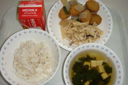 今日の献立は,「麦ごはん・牛乳・たけのこごはんの具・平天の煮つけ・すまし汁」でした。