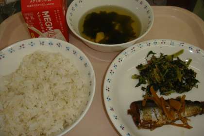 今日の献立は,「麦ごはん・牛乳・さんまのかわり煮・だいこん葉のごまいため・若竹汁」でした。