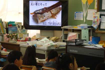 1年生にとっては,初めての煮魚でした。上手に食べられるようにDVDを用意しました。TVの画面を見ながら,1年生も上手に食べていました。