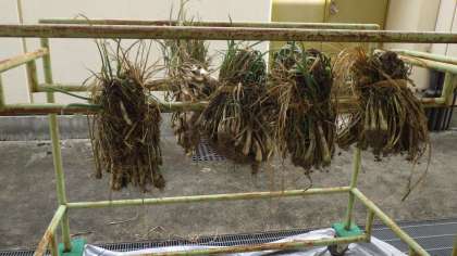 農家の方より,九条ねぎの苗を預かり,苗を校内で干しています。