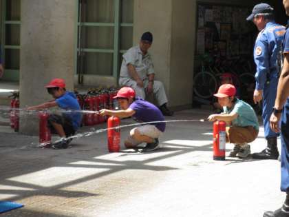 避難訓練の後,3・4時間目に4年生が防災体験を強いました。119番通報の仕方,消火器訓練,災害時に役立つ器具の使い方,消防車の見学を4グループに分かれて順番に見学しました。身近にあるものを活用して担架にしたり,消防車の秘密を学んだりしました。大変,学びの多い2時間でした。地域の皆様,ご協力をありがとうございました。