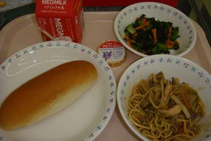 今日の献立は,「小型コッペパン・牛乳・ソース焼きそば・小松菜のソティ・クリームチーズ」でした。