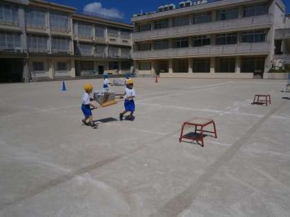 団体競技,「おたからゲットだぜ!」の練習をしました。おみこしにお宝を載せ,二人組で運び,リレーをする競技です。とても慎重に運んだり,スピードを出そうとして,お宝を落としてしまったり,それぞれの個性が光っていました。見ていてもとても楽しい競技です。
