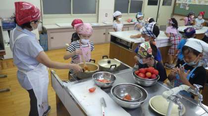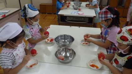 凍ったトマトを水に数秒つけると,するすると皮がむけてびっくりしている様子でした。