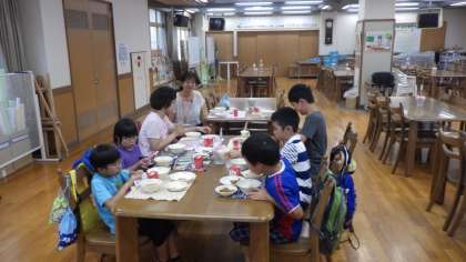 わかたけ学級が,科学センター学習後,ランチルームで給食を食べました。