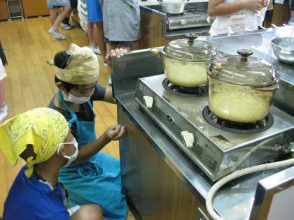 ご飯を鍋で炊き,煮干しからお味噌汁を作りました。