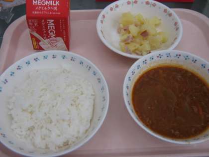 今日の献立は,「ごはん・牛乳・ハッシュドビーフ・ジャーマンポテト」でした。