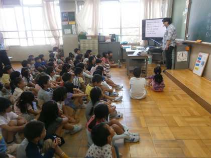 1年生は学習発表会で「くじらぐも」の劇をする予定にしています。そこで,音楽の時間に学年みんなで「くじらぐも」の歌を聞きました。すてきなメロディーを聞いた子どもたちは,「楽しそう!」「やりたい!」と学習発表会への意欲を高めていました。
