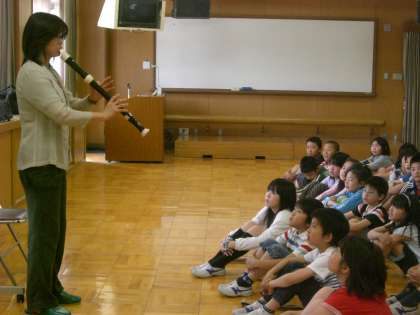 今日,リコーダーの講師の先生にきていただき,リコーダー教室を行いました。3年生の子どもたちは,大きなバスリコーダーから小さなソプラニーノのリコーダーまでの演奏を聞かせてもらい大喜びでした。自分たちもはやく上手に吹きたい気持ちになってきました。リコーダーがうまくなるコツは,「息」「舌」「指」の3点に気を付けることだと教わりました。これから頑張って練習し,はやく素敵な曲が吹けるようにしましょう。
