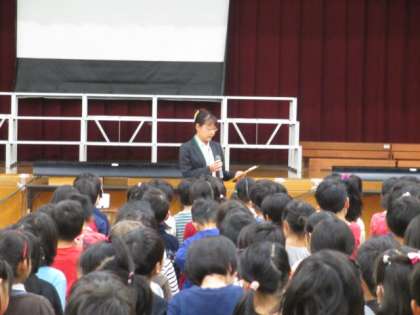 11月の朝会がありました。校長先生のお話の後,5年生がにじょっこタイムで発表しました。花背山の家宿泊を振り返り,心に残ったことや学んだことを発表しました。