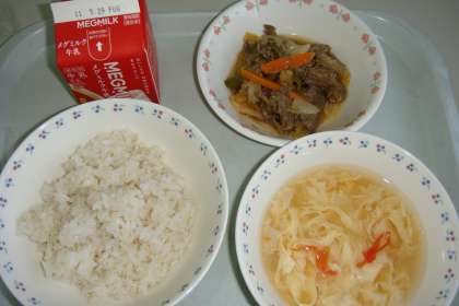 今日の献立は,「麦ごはん・牛乳・焼肉・トマトと卵のスープ」でした。
