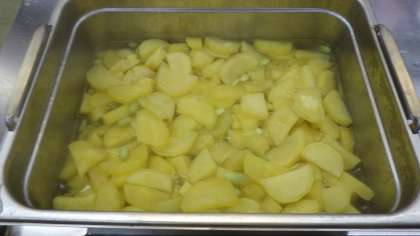 スチームコンベクションオーブンを使って蒸しました。煮崩れなく,さつまいもの黄色と枝豆の緑色がきれいな彩になり仕上がっていました。