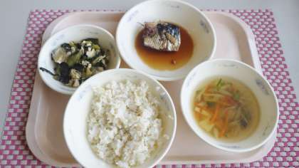 「こまつなとゆばのにびたしがおいしかったです。さかなのにじるとごはんでたべたらおいしかったです。」(1年児童)