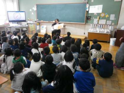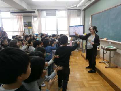 外国語活動の時間に,ALTの先生が英語の絵本「はらぺこあおむし」の読み聞かせをしてくださいました。色や数の英語の言い方を聞いたり,真似をして繰り返し言ったりしました。学習の最後には,英語でジャンケンゲームをしました。1時間,楽しく英語に親しむことができました。