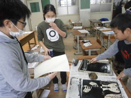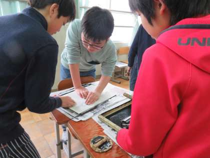 前回に比べて,刷りの作業に入る子どもが増えてきました。お互いにアドバイスしながら,作業を進めます。写真は,ローラーを使ってインクをつけている様子です。完成まであと少しです。