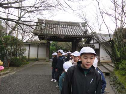 竜安寺では,石庭やつくばいを見学しました。写真は,軒下にゆったり腰を下ろし,石庭を眺める子どもの様子です。
