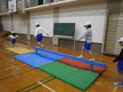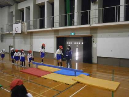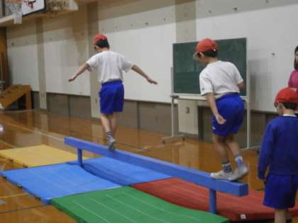 体育科で「平均台あそび」をしました。初めはこわごわ渡っていた児童も,体のバランスをとりながら上手に渡れるようになってきました。