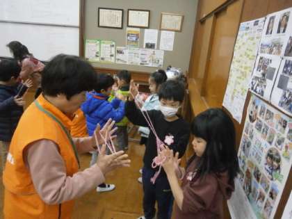 生活科の時間に,地域の方に来ていただいてむかし遊びを楽しみました。こま,けん玉,あやとり,めんこ,お手玉,竹とんぼ,おはじき,羽根つきの8つの遊びコーナーがありました。どの遊びも,こつをつかむのが難しかったですが,教えてもらって何度も挑戦していました。