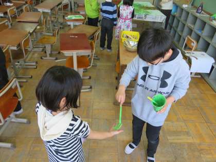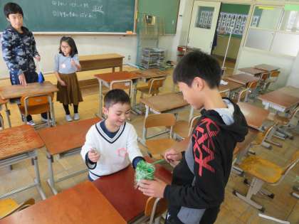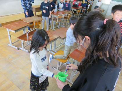 前回紹介した,卒業に向けて製作してきた「木」の作業がいよいよ完成目前です。今日は1年生が,木の葉っぱの部分を手形で押していました。写真は本部委員とお手伝いの子ども達が,1年生の手にインクを付けている様子です。