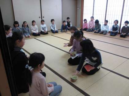 1・2年生が茶道の体験をしました。お席入りや座り方の作法を教えていただき,お菓子とお茶をいただきました。茶道部員が優しく教えていました。