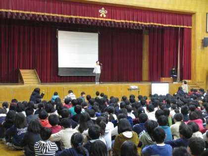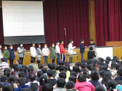 今日のにじょっこタイムは,草の芽学級の発表でした。各学年のお話会で話したことを1年生と6年生の代表が発表しました。1年生はがんばったこと,6年生は将来について考えたことを手話を交えて,堂々と話しました。たくさんの人が,感想を伝えました。