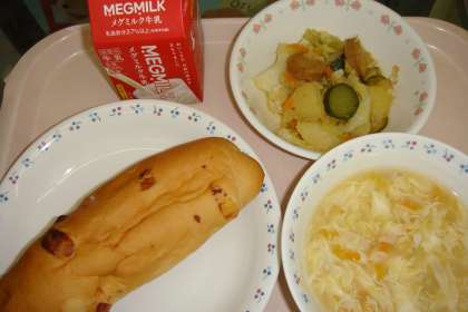 今日の献立は,「チーズコッペパン・牛乳・ソーセージと野菜のいためナムル・中華コーンスープ」でした。