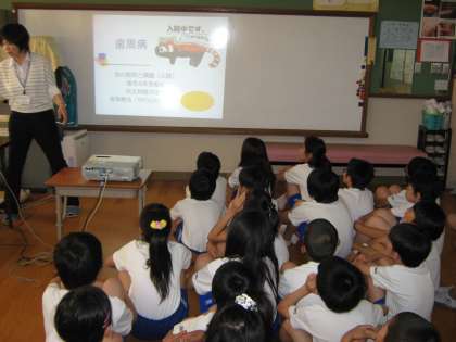5年生は、「歯周病」についての保健指導を行いました。歯周病になったレッサーパンダの話から歯周病やその予防方法について保健指導をしました。初めて歯周病について学んだ5年生は、歯を失うこともある歯周病の話に驚いていました。これからはむし歯予防だけでなく歯周病予防のためにも歯をみがくようになってくれると思います。保健指導後、さっそく鏡で自分の歯肉をチェックしている児童の姿が見られました。