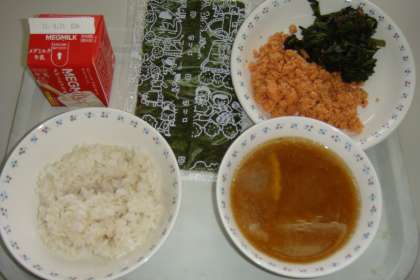 今日の献立は,「麦ごはん・牛乳・セルフおにぎりの具(手巻きのり)・ほうれん草のおかか煮・みそ汁」でした。