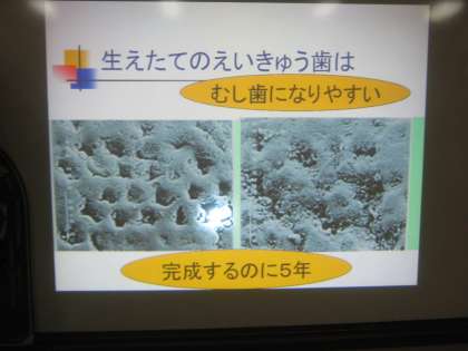 自分のあごの中に、これから生えてくる永久歯が育っているという話を聞いて子どもたちは驚いていました。また生えたての歯の拡大した写真から、むし歯になりやすいことを知り、ていねいに歯をみがくことが大切であることに気づきました。