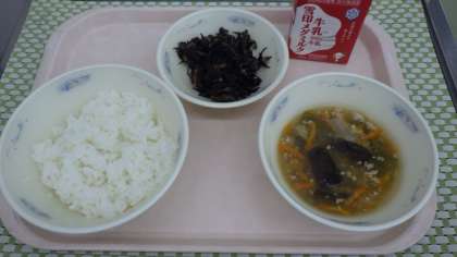 1年生の教室では,初めてひじきを見たという子,なすや万願寺とうがらしを初めて食べる子がいました。はじめはすごく不安そうにしていましたが,友達の美味しいという声で食べ始めて,美味しかったという感想を言ってくれていました。