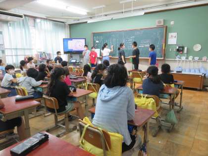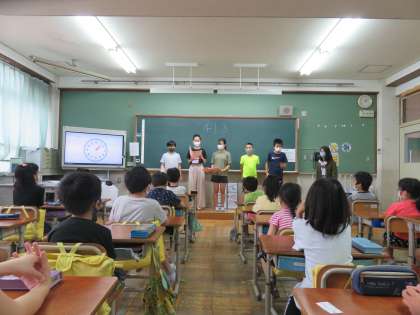 今回のにじょっこ活動は,子どもたちが4色に分かれて各担当教室に集まりました。