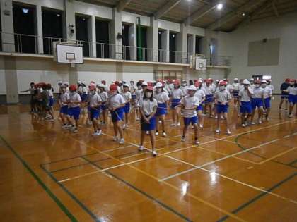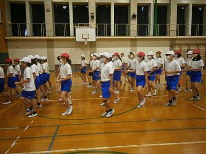 今日は,斜めに行進する練習をしました。列を崩さず,斜めに進めるようにテープをもって行いました。初めは難しくてうまくできませんでしたが,だんだんときれいな行進ができるようになりました。最後には,家庭科で作った旗をもって行進練習を行いました。