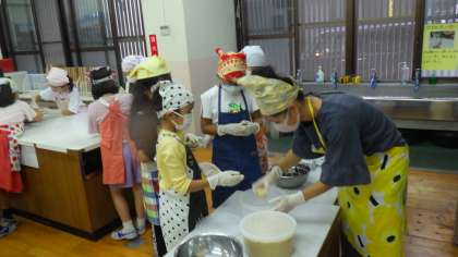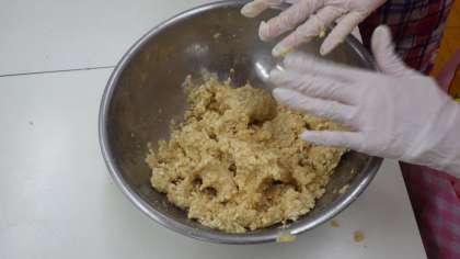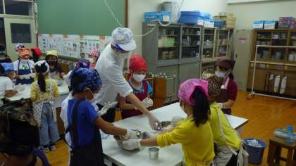 児童は,大豆一粒一粒を大切につぶしていきました。そこに米麹と塩を混ぜて味噌ボールを作り,担任が味噌用タッパーに詰めて入れていきました。