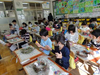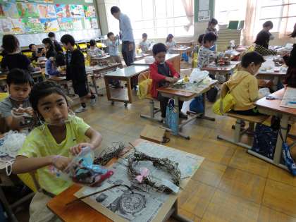 先週,アサガオのつるで作ったリースに,リボンやモール,どんぐりやまつぼっくりで飾りをつけました。それぞれくふうして,自分だけの素敵なリースができました。いろいろ材料を準備していただき,ありがとうございました。