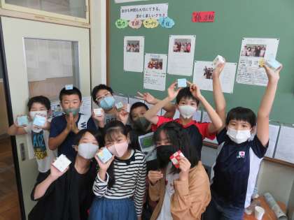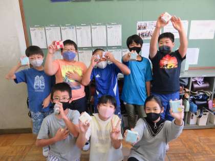 出水女性会の皆さんからエコ石鹸を頂きました。エコ石鹸は食用油に苛性ソーダー(水酸化ナトリウム)を混ぜて作られた石鹸です。廃油を減らせるうえに,油汚れに強いという便利で環境にやさしい物です。5年生のこ子どもたちは大喜びでした。出水女性会の皆さん,ありがとうございました。