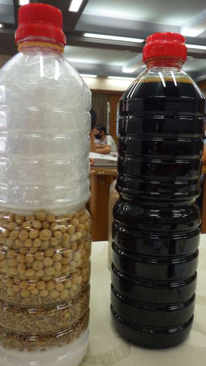 2枚目の写真は,しょうゆの原料をボトルにいれたもの。
