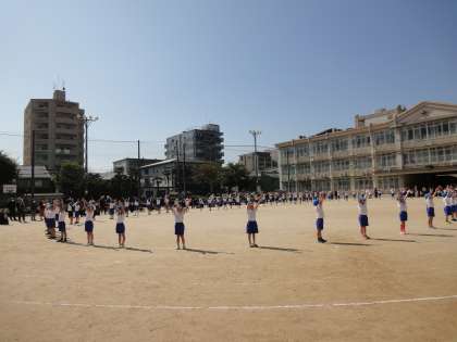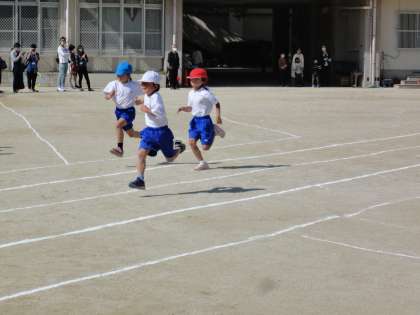 いいお天気に恵まれて,スポーツウィークを開催しました。整列して入場した後,準備体操をして,50メートル走をしました。みんな力いっぱい走りました。そのあと,リズムあそびの単元で学習したダンスを曲に合わせて,楽しく踊りました。たくさんの保護者の方や幼稚園のお友達に見ていただいて,子どもたちは,はりきって踊っていました。