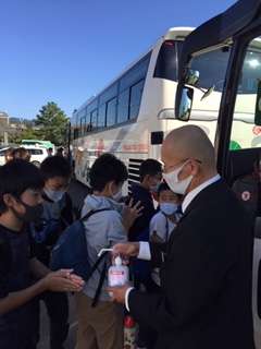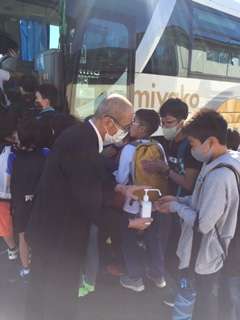 バスに乗るときは必ず消毒をします