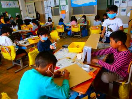 どんぐりや松ぼっくりを使って,秋のおもちゃを作っています。松ぼっくりのけん玉やどんぐりゴマなどいろいろな実を使って,楽しいおもちゃや飾り作っています。来週には,6年生を招待して「あきのおもちゃランド」を開く予定です。