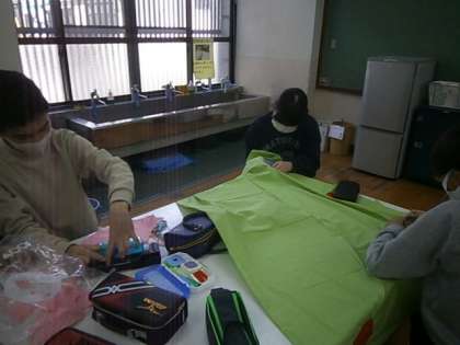 家庭科の時間に,卒業記念として各学級で使ってもらえるランチョンマットを作っています。今日は,ミシンを使って縫ったり,デザインに合わせてフェルトを縫い付けたりしました。まだ少し時間がかかかりそうですが,使うみんなのことを考えて一生懸命制作しています。出来上がりを楽しみにしていてください。