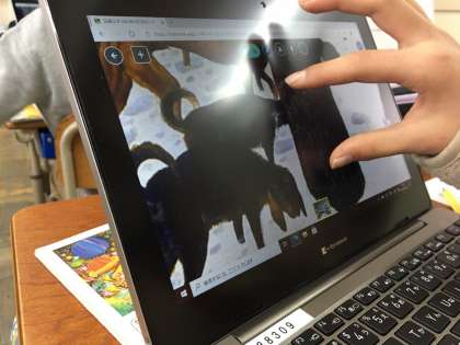 個人で作品の気に入った部分を拡大したり,みんなで山本先生の指示に従い,作品の重要なポイントに注目したりする様子が見られました。子供たちは目を輝かせながらブリューゲルの世界を楽しんでいました。