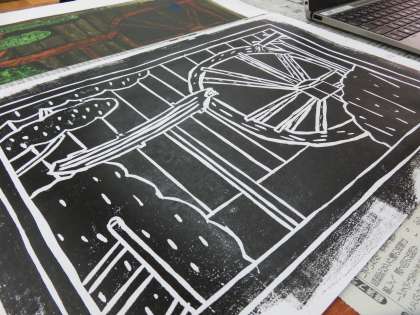 以前多色刷りに使用した版を使って,今日は白黒の刷りに挑戦しました,出来上がった作品を見比べ,気付いたことをGIGA端末に入力します。