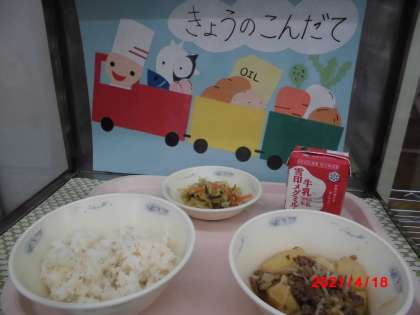 4月19日(月)麦ごはん・牛乳・肉じゃが・ごま酢煮