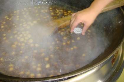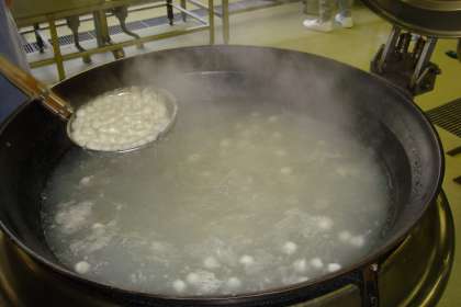 学校では,みたらしだんごをゆがいて「たれ」にからめました。中心温度も計っています。